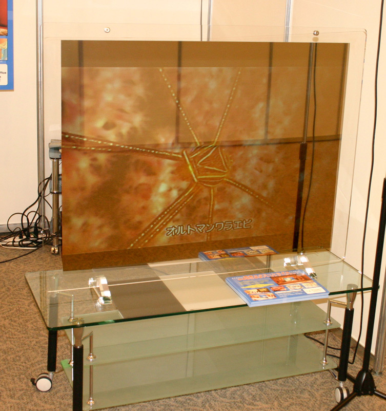 | ■あっちからも?こっちからも?「両面スクリーン」の不思議 ティーエスビー アドバンスド・ステージは、独自のアイディアと技術で生み出された、さまざまなA&Vアクセサリー製品のプレゼンテーションの場でもあります。ティーエスビーが出品するのは、不思議な「両面スクリーン」。スクリーンの前後両面に映像を移すことができるスクリーンで、室内の間仕切りや病院の待合室などのインフォメーションボードとしての用途が提案されています。