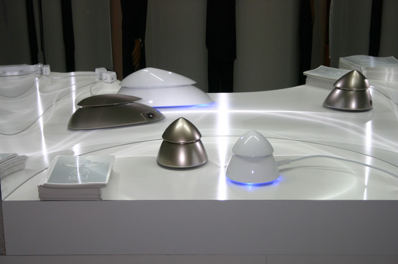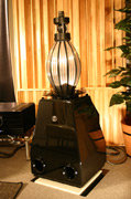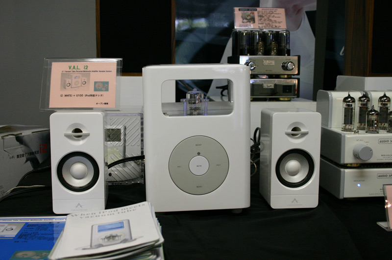 カインラボラトリージャパン カインラボラトリーに出品されている「V.A.L. i series」。プレゼントコーナーにも出品されているこの製品は、実はデジタルオーディオプレーヤーiPodの意匠を受け継いだ真空管アンプ。iPodをはじめ、さまざまなプレーヤーが接続でき、中央の本体にはサブウーファーが搭載され、2.1chのサウンドが楽しめるそうです。真空管とiPodのこんな融合もあるんですね。