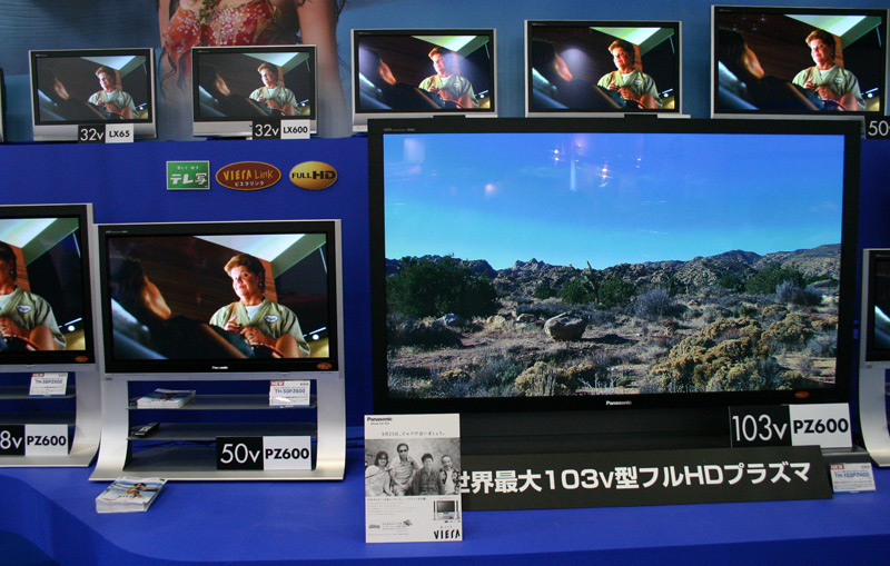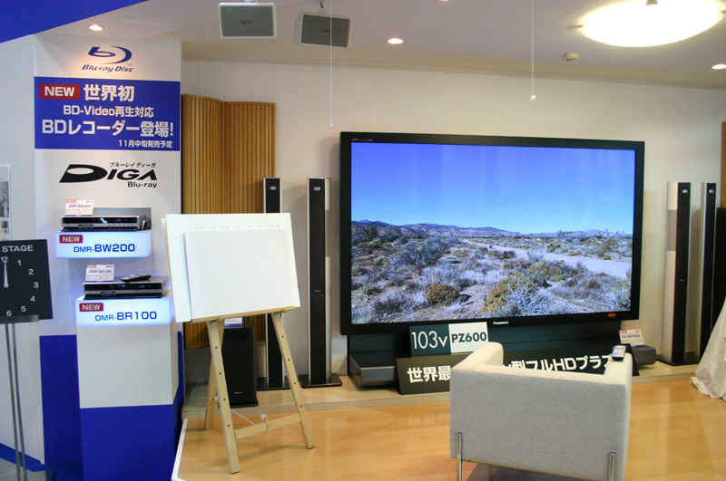 | ■まるで壁一面がテレビになったような、103v型プラズマテレビ 松下電器産業 昨年のA&Vフェスタ2005で、60v型のプラズマテレビが登場してその大きさに驚きましたが、今年は103v型が登場。まさに壁面そのものがテレビのような大きさ。しかも、フルHDによる高精細な映像。まるで映像の中に自分がいるかのような錯覚にとらわれてしまいます。