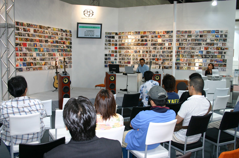 | ■より、リアルな原音へ。高品位な音の世界を楽しむSACD試聴ブース ソニー/ソニーマーケティング このブースではタイムスケジュールにしたがって様々なデモンストレーションが展開されています。SACDと通常のCDの音の比較や、ギターの演奏をレコーダーで録音してその音を楽しんだりといった実験的な試みも。これまで知らなかった音の世界が、きっと体験できます。