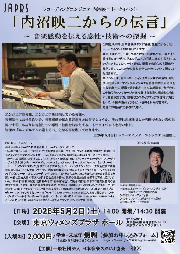 JAPRS(日本音楽スタジオ協会)主催によるJAPRSトークイベント”「内沼映二からの伝言」~音楽感動を伝える感性・技術への深堀~”を開催します。