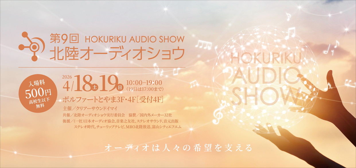 日本オーディオ協会が後援する「第9回 北陸オーディオショウ」が、日本オーディオ協会が後援する「北陸オーディオショウ」が2026年4月18日(土)~19日(日)の2日間、ボルフォートとやまにて開催されます。