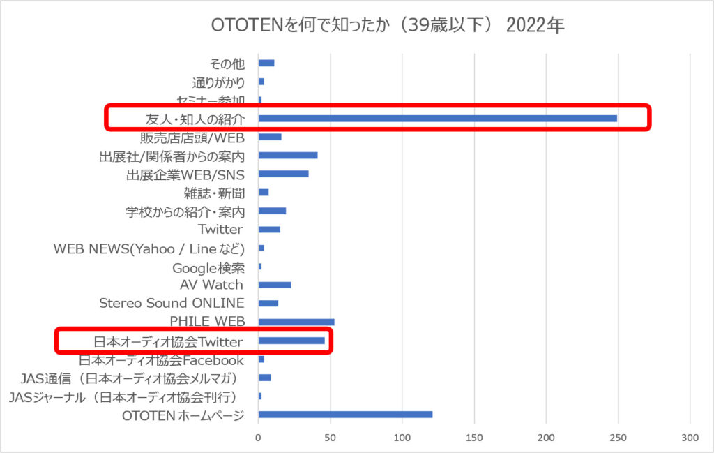 「OTOTENを何で知ったか?」という情報ソースにも変化が見られました。39歳以下の若い世代では「知人・友人の紹介」という口コミが大きなウェイトを占めることが昨年の調査で判明していたため、今年は音響系専門学校や大学にOTOTENの案内状を送付しました。その結果、「学校からの案内」が大きく伸びました。