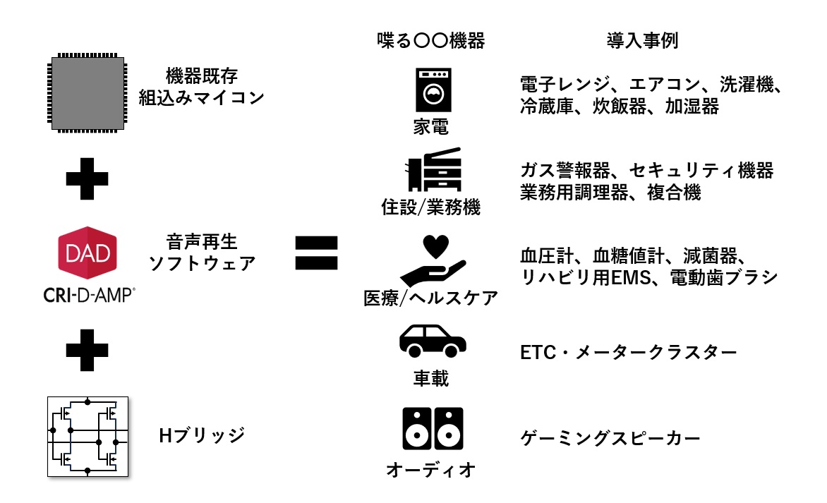 近年、家電・産業・車載機器では機能の高度化・多様化に伴い、「音声」によるユーザーインターフェース(UI)の重要性が高まっています。音声による操作確認・警告・状態通知により、製品の使いやすさが格段に向上します。このようなニーズのもと、D-Ampは2010年代に組込みマイコン(*3)上で直接動作する軽量な音声再生ミドルウェアとして誕生しました。