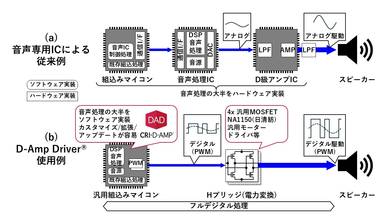 図2 音声専用ICによる従来例とD-Amp Driver®使用例の比較