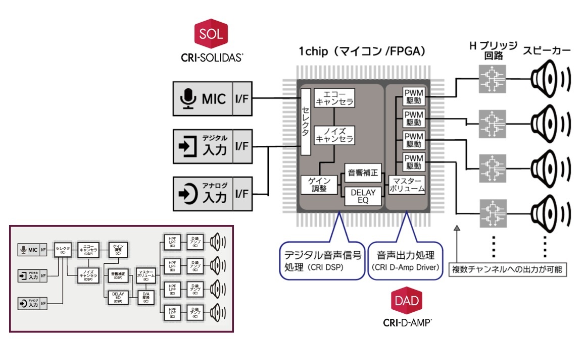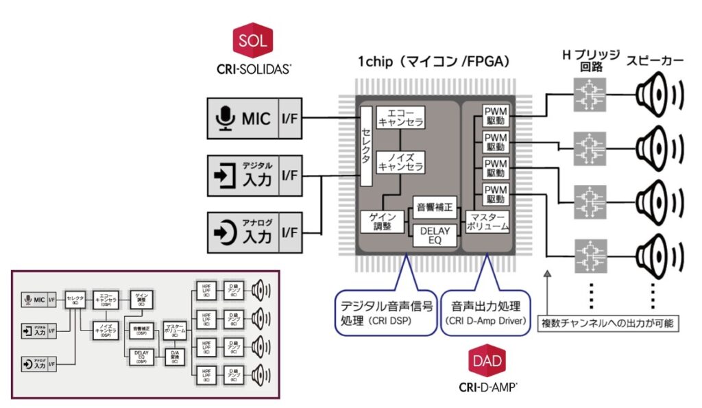 マイコンの高性能化は、D-Amp(アンプ機能)の高音質化、マルチチャネル化を可能とするだけでなく、たったひとつのマイコンで、アンプを含む音響システム全体を構築することをも可能にします。この考え方を推し進めたものが「CRI SOLIDAS(以下SOLIDAS)」です。