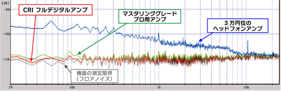 先に示した図2の通り、D-Ampは音源の音声処理からスピーカー端までフルデジタル処理を行い、スピーカーを直接パルス駆動します。スピーカーやHブリッジ素子、電源を除き、アナログ要素がほとんどないため、ノイズや歪みの少ない、原音に忠実な音声再生が可能です。図4にD-Ampの残留ノイズを示します。D-Ampは、スタジオで用いられるマスタリンググレードのプロ用アンプと同等な残留ノイズ特性が得られています。
