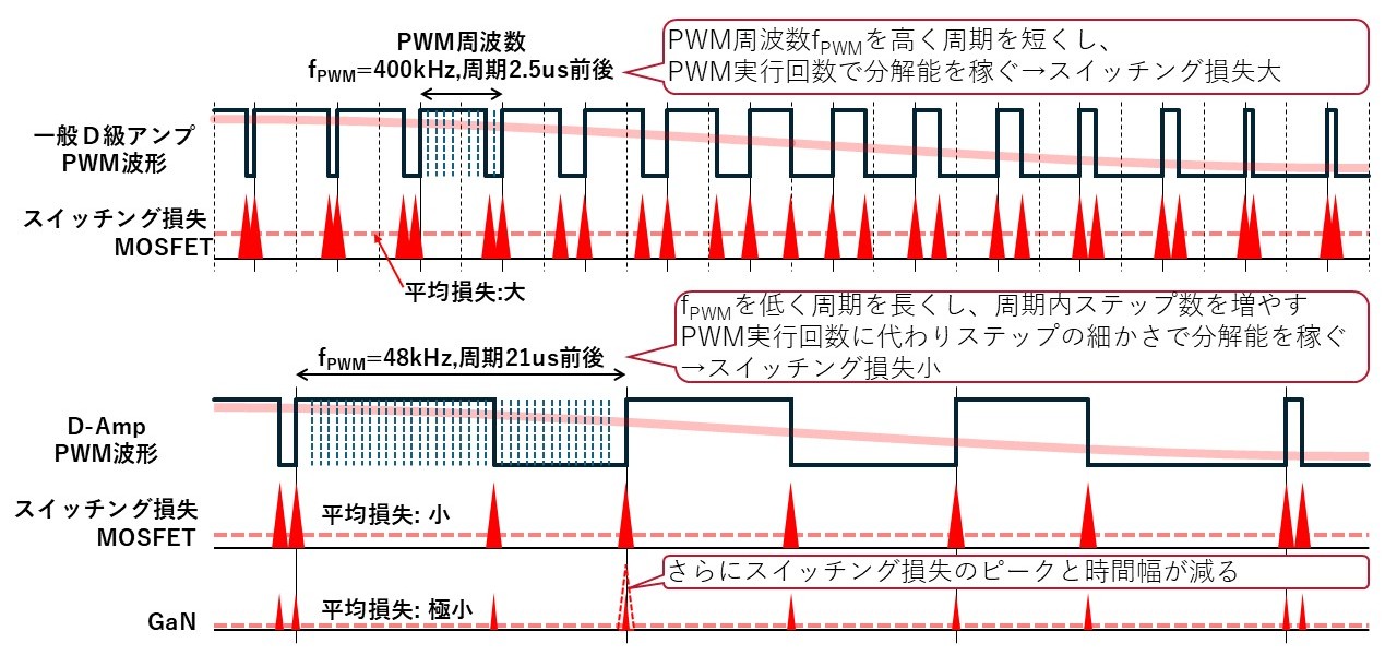 一方、D-AmpではfPWMをあえて音源のfs(サンプリング周波数)と同じ48kHz程度に抑え、その代わりに1周期内のステップ数を細かく設定することで分解能を確保します。これにより、出力段のスイッチング回数を少なくし、発熱・電力損失を大幅に低減しています。