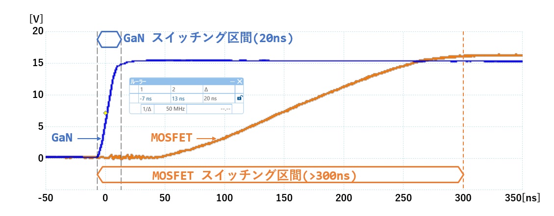 図8は、MOSFET版D-AmpとGaN応用D-Amp試作品のPWM立ち上がり波形を比較したものです。立ち上がり時間はMOSFETの300ns以上に対し、GaNは20nsつまりMOSFETの1/15以下という驚異的な速度です。この違いは、主にMOSFETとGaNの寄生容量やデッドタイム(*11)の違いに起因します。この瞬時に立ち上がる特性は、スイッチング損失の少なさだけではなく、スピーカー駆動の正確さ、リニアリティ向上など、音質的な効果が期待できます。