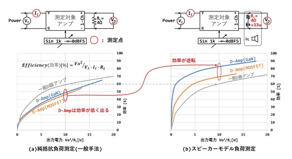 図9は、一般のD級アンプと、D-Amp(MOSFET/GaN)の効率比較例です。一般的にアンプの効率は、図9(a)のように純抵抗負荷における出力電力とアンプの入力電力の比で測定します。しかしD-Ampは誘導性負荷のスピーカーを直接パルス駆動する方式です。純抵抗負荷で測定するとパルス成分が全て熱損失となり、一般のD級アンプに比べて低効率な結果となってしまいます。