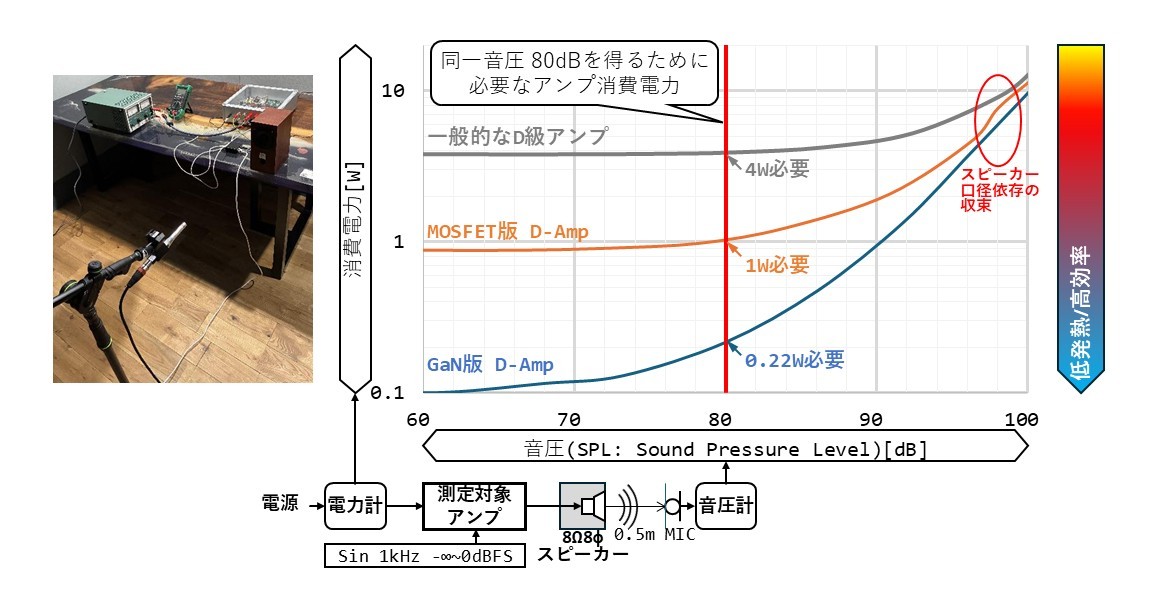 図10は、3種類の測定対象アンプに繋いだスピーカーの出力音圧と、各アンプの消費電力の関係をプロットしたベンチマーク図です。かなり珍しいアンプの測定方法ですが、スピーカーを含めたアンプの真の効率を比較することができます。グラフ中央の赤線は、各アンプで80dBの同一音圧を得るための消費電力レベルを示しており、低いほど「優秀」となります。一般のD級アンプに比べ、D-AmpのMOSFET版は1/4、さらにGaN版は1/10以下の消費電流で同一音圧が得られることになり、お客様の「D-Ampは音圧が高い」という評価を実証したものとなります。