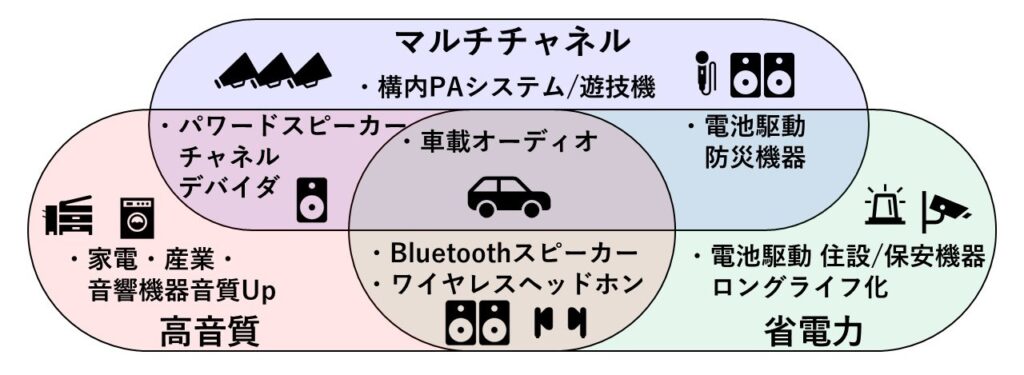以上のように、D-Ampは当社の開発研究、お客様との協業、各種デバイスの高性能化を通じて日々進化し、Hi-Fi音質、マルチチャネル、そして優れた省電力を実現してきました。これらのD-Ampの特長を活かし、今後新たに展開が期待できる分野を図11に示します。