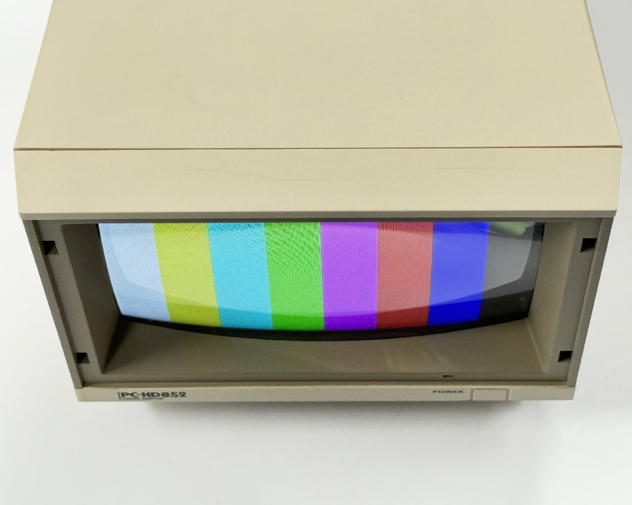 PC-KD852miniは、PC-KD852[当時の14インチブラウン管カラーディスプレイ]を1/4サイズで再現するために、3.5インチ小型液晶モニターを用いて製作されたカラーディスプレイです。当時の640×200ドットのカラー表示を再現しています。