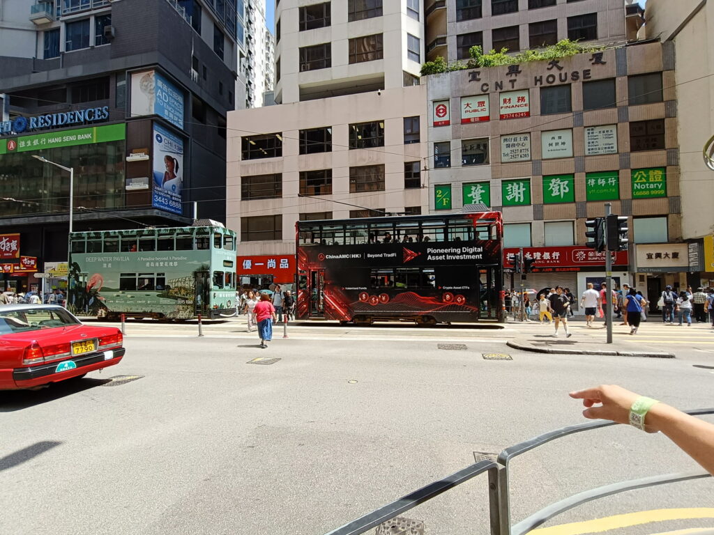 香港島のメインストリートはとてもきれいで近代的。街を走る赤いタクシーは印象的で、イギリスの影響を感じさせるカラフルな2階建てバスや路面電車が走っていました。一方で、少し奥に入ると古いアパートが密集しており、建物の外に取り付けられたエアコンの室外機から水が滴り落ちてくるため、歩く際には注意が必要です。昼食は現地のローカルな食堂で頂きましたが、物価は日本と同じくらいか、やや高めに感じました。
