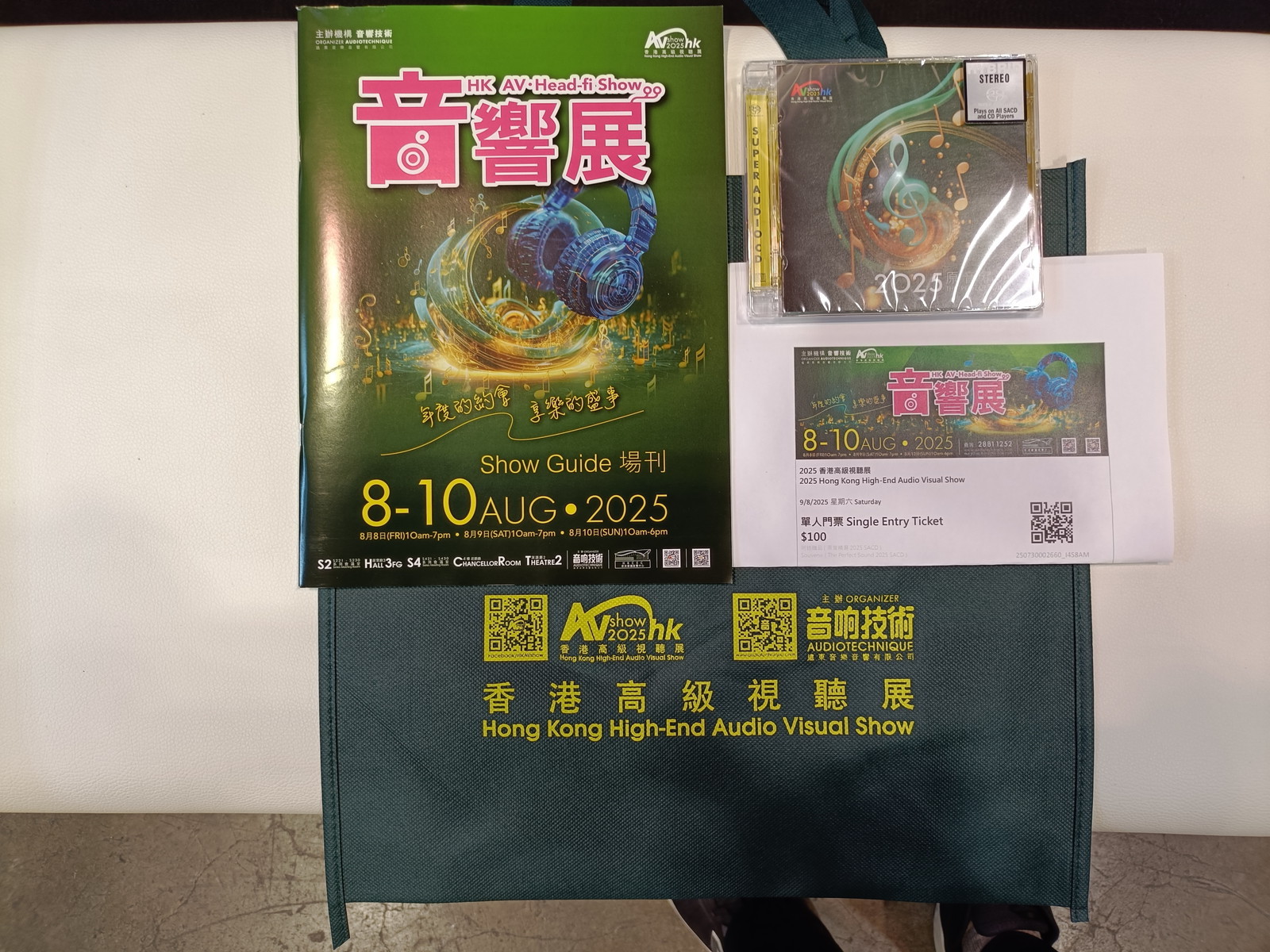 今年の香港高級視聴展のキービジュアルは昨年の黄色から緑に変更され、ヘッドフォンから音符が流れ出すデザインで、実際のところ、ヘッドフォンの展示が多く見受けられました。事前登録で2日分のチケットを約2,000円/日で購入。配布物は会場パンフレット、QRコード付きリストバンド、トートバッグ、SACDで、今年はクーポン券はありませんでした。