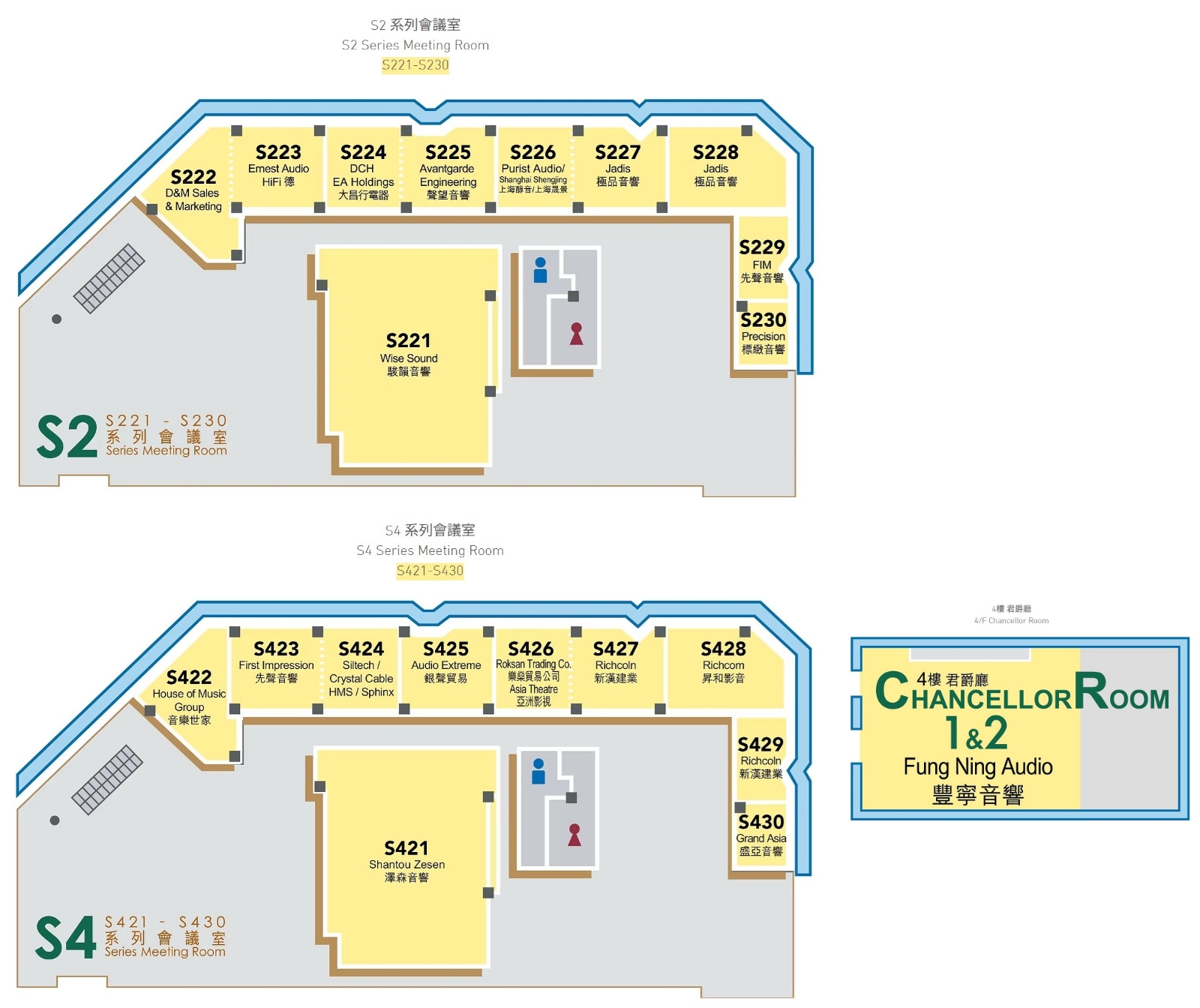 2F:S2会場には試聴用の会議室が10部屋あり、4F:S4会場には試聴用の会議室が10部屋と、大規模な主賓会場「CHANCELLOR ROOM」があって、ハイエンドオーディオ機器を取り扱う代理店が出展し、デモが行われていました。