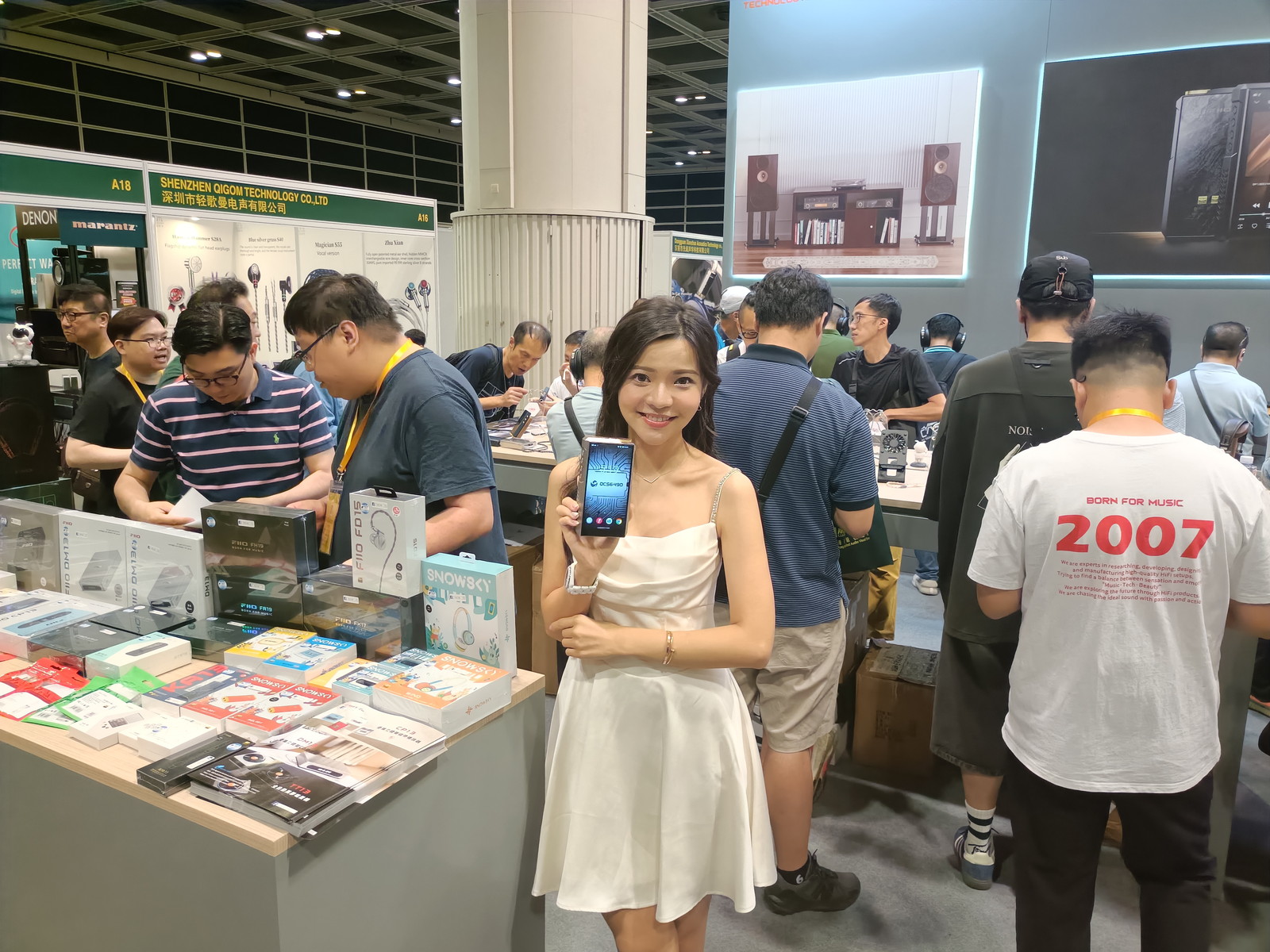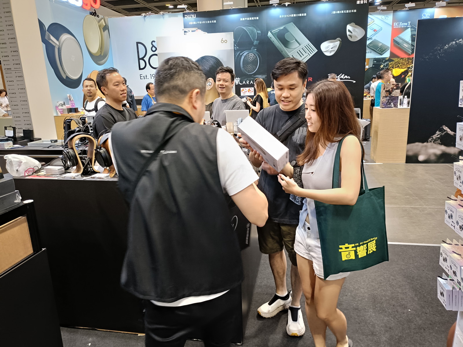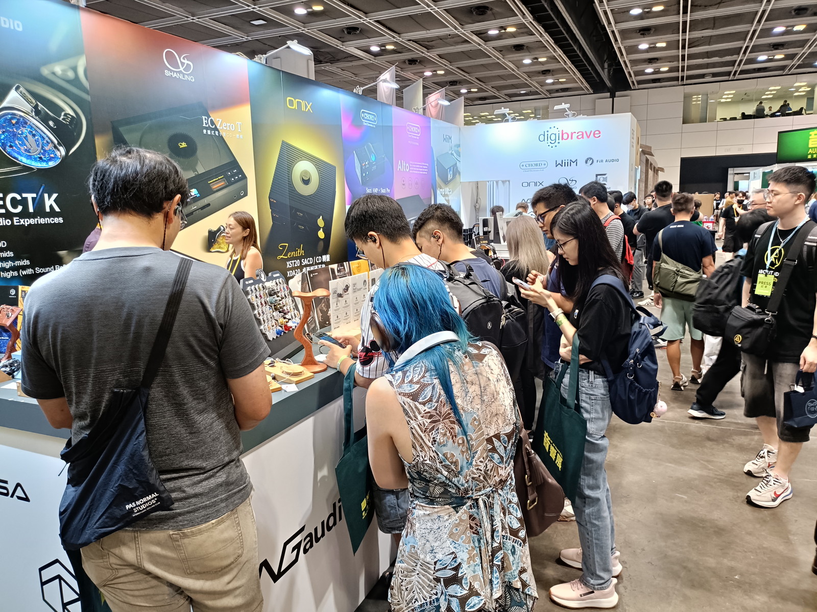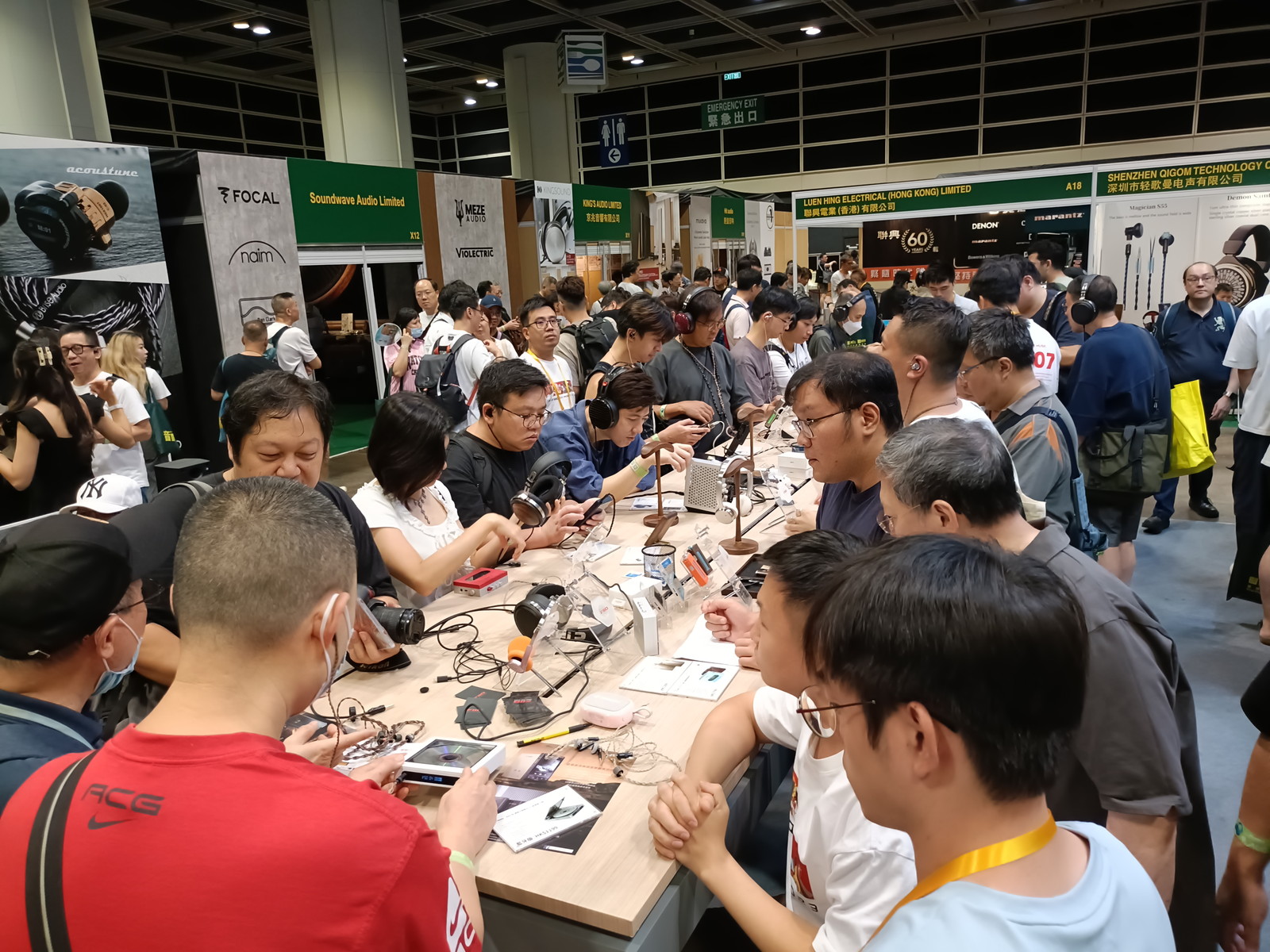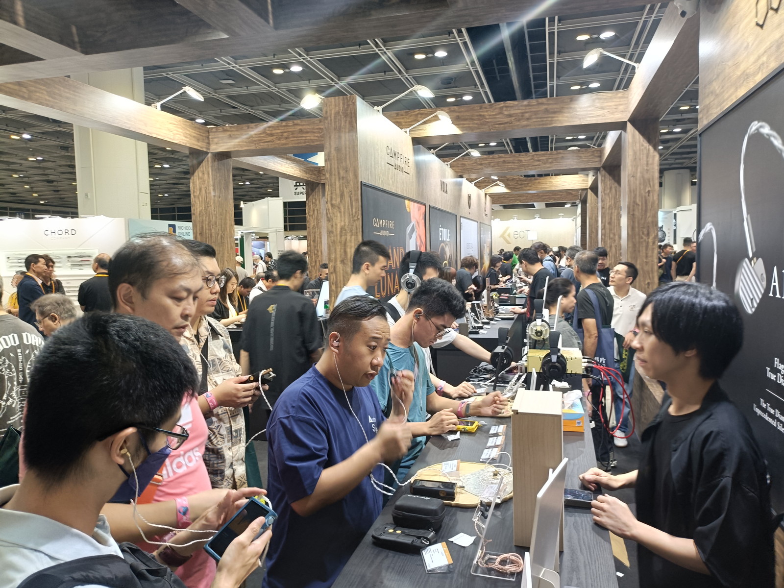 今回の香港オーディオショウの特徴とも言えるほど、多くのポータブルオーディオ機器が展示されていました。ヘッドフォンやイヤフォン、アンプシステムを立ったまま気軽に試聴できるようになっており、気に入ったらその場で購入する来場者もいる様子でした。「特別価格にしますよ!」といった熱心な売り込みもあり、会場の活気をさらに高めていました。
