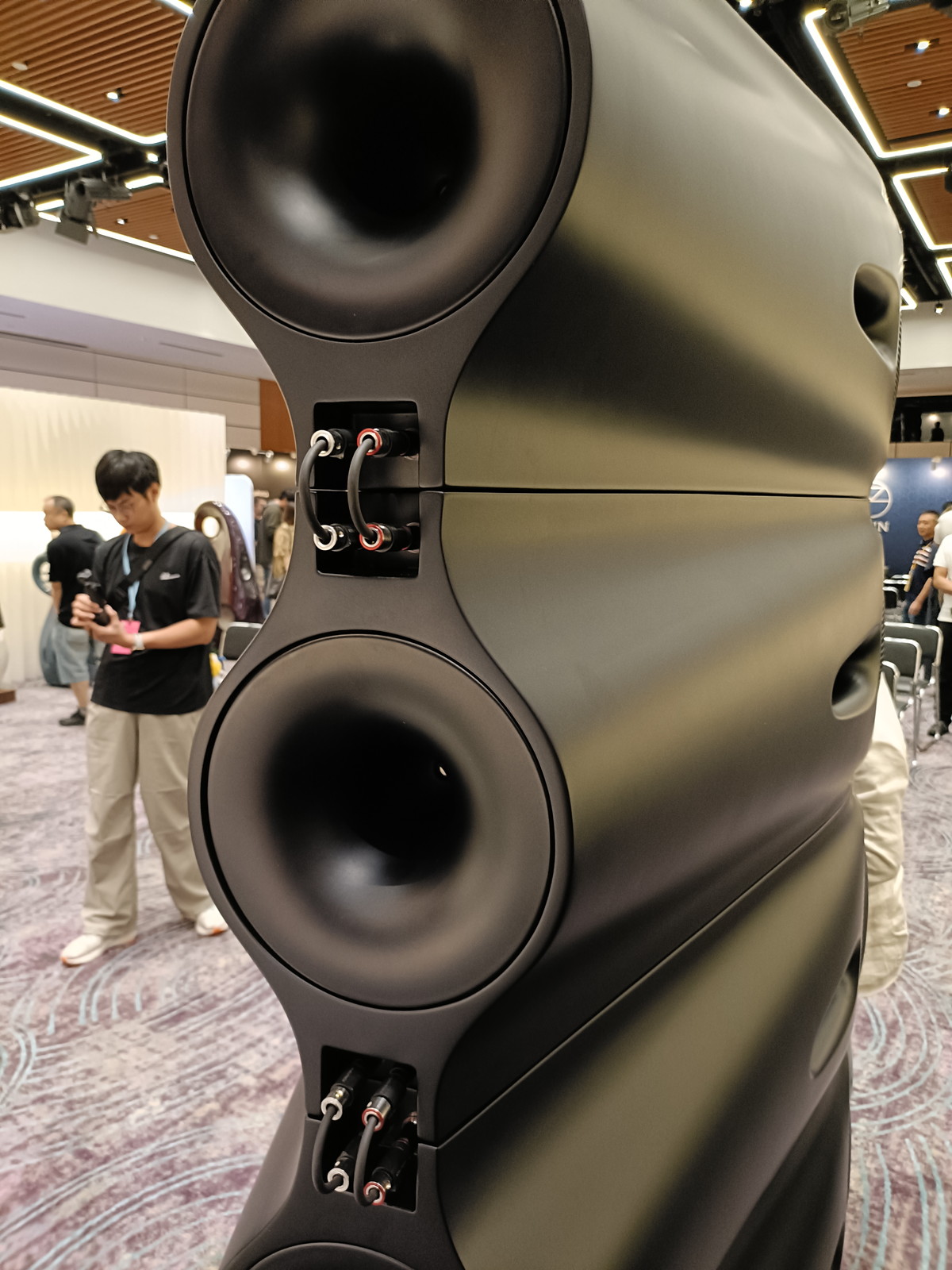 会場では、各国からユニークなデザインのスピーカーが数多く展示されていました。中でも印象的だったのは、VIVID AUDIO(南アフリカ)の「Moya M1」です。ペアで約8,000万円という超高級モデルで、デザインが「宇宙戦艦ヤマト」に登場する白色彗星帝国の戦艦のような迫力あるフォルム。外観のインパクトに加え、数多くのドライバーが搭載されていることもあり、その音は圧倒的で、迫力あるサウンドを響かせていました。