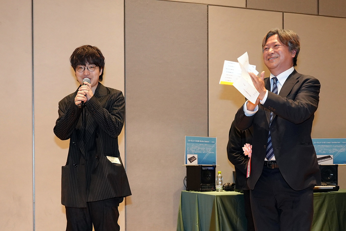 末永)ローランド、ヤマハ、コルグの特長をうまく使い分けて演奏されていたという向谷さんの話もとても興味深かったと思います。向谷さんが愛用された3社の代表モデルであるD-50、DX7、M1が会場内にも展示され、懇親会中も人だかりが絶えなかったですね。各社様のご協力に本当に感謝です!