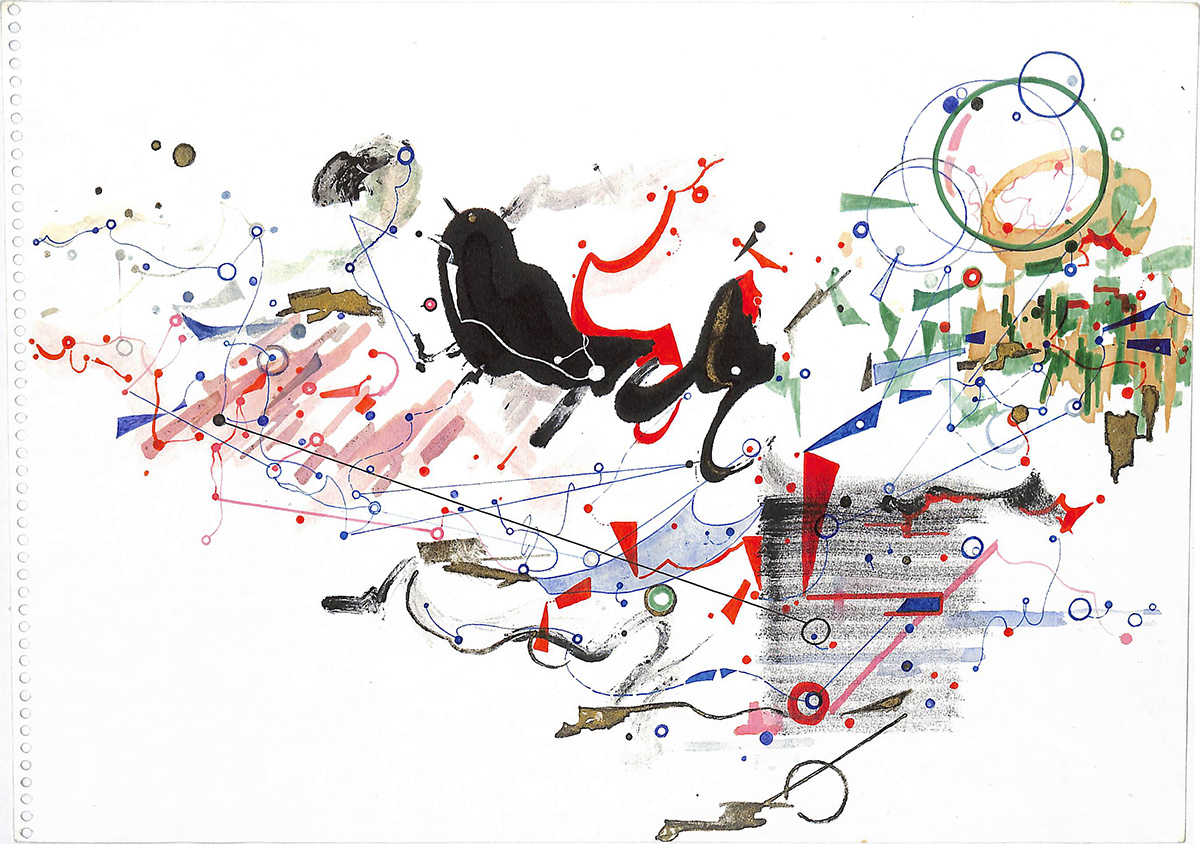 一方、仲氏の後輩で大正11年(1922年)生まれの松下眞一氏は、作曲家であると同時に、旧制第三高等学校(現京都大学)を経て、九州大学理学部を卒業された位相解析学を専門とする数学者(理学博士)でもありました。従って、生涯の多くを数学者として国内外の各種大学や研究機関に所属されつつ、作曲家としても華やかな活動実績をあげられました(表1)。当時は、第二次大戦後に急速に進歩し始めた電子技術の影響が音楽や音響技術の世界にも及び、世界的に前衛電子音楽の華やかなりし頃でした。日本でも、詩人の瀧口修造氏を中心に結成された実験工房に参画した武満徹氏、湯浅譲二氏らを始めとする、松下氏と同世代の音楽家達によって、伝統的なクラシック音楽の枠組みにとらわれない様々な試みが行われました。松下氏自身も、五線譜では表現しきれない音の様々な変化を色鮮やかなグラフィック楽譜として描いたり、哲学的エッセイを執筆するなど、多様な才能に恵まれていました(図1)。