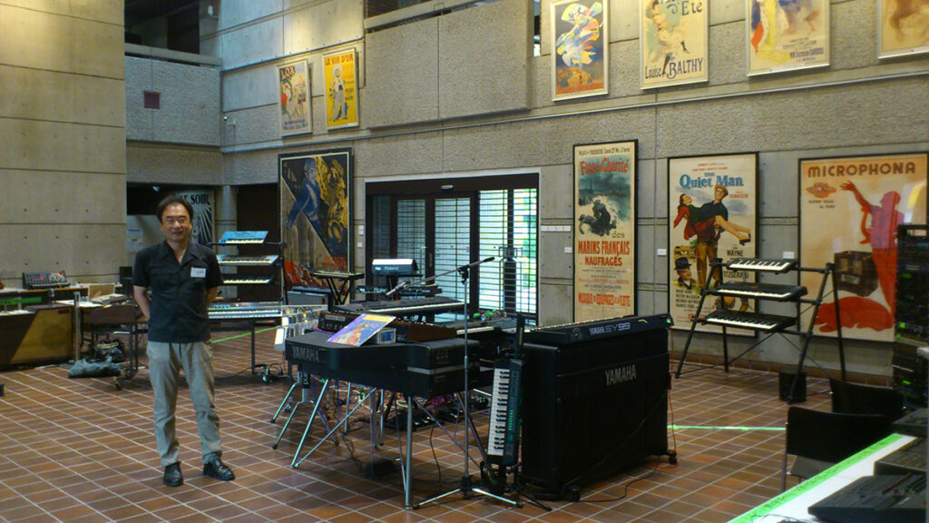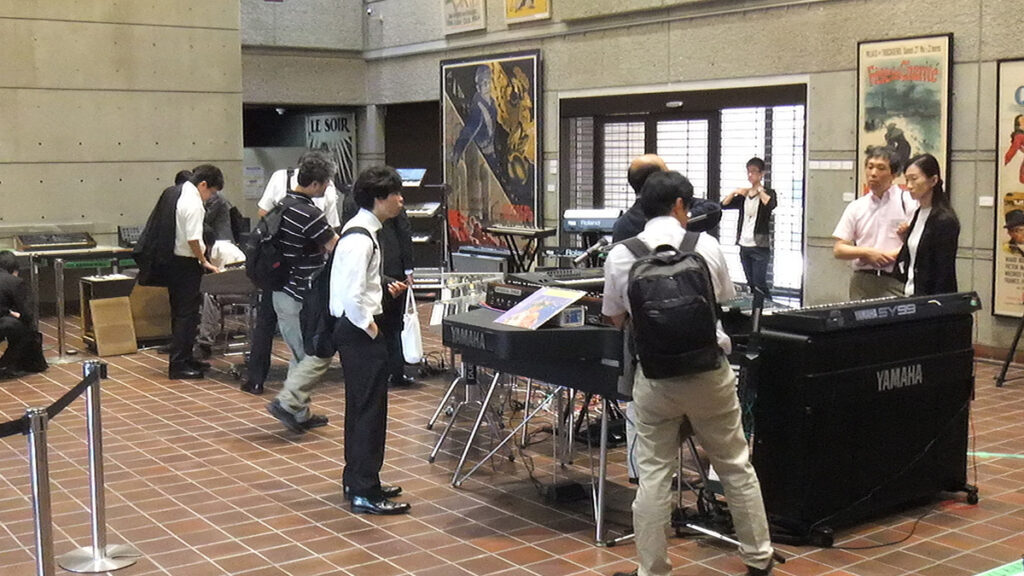 更に、ヒューマンインタフェース学会の2014年度シンポジウム講演会にて、ヤマハやコルグ、ローランドといった電子楽器メーカー及び浜松楽器博物館の協力・協賛を得て、過去から現在に至る50台ほどのシンセサイザーの名器を紹介し、動態展示するイベントを企画・運営する機会を得ました(写真8、9、10)。これは自分自身の長年の夢がかなった瞬間でもありましたが、こうした経験が後々本稿でご紹介している松下氏の音源再現事業にまで発展し結びつこうとは、その時は全く想像だにしていなかったことでした。