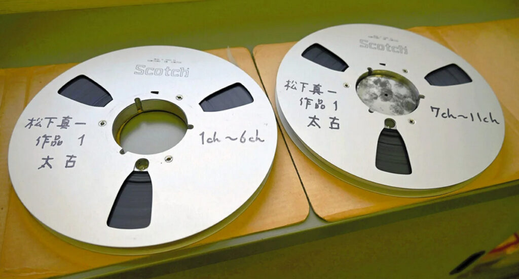 さて、こうした70年万博当時の社会的背景や意義を踏まえた上で、時はあたかも再び万博が大阪に巡ってくる2025年を目前に控えており、このタイミングで「太古」を再現できれば誰にでも容易に重要性を納得してもらえると期待に胸を膨らませて、ひときわ目立つ大型の梱包を解いてみました。いくらかカビやほこりが付着していたものの比較的状態は良好なようでしたが、テープ幅が一般的な市販製品に比べて倍ほどある1/2インチの業務用であり、私の手持ち機材では再生できないことがわかりました。アナログ録音機器におけるテープ幅や録音時のテープ速度は音質に強く反映されるため、高音質なプロ仕様では数値が大きくなります。早速レコーダーのメーカーに問い合わせてみると、70年万博の頃に市販されていたレコーダーには該当する機種がなく、万博の特注仕様であった6トラックのマルチトラックレコーダーに対応したテープであろうとのことでしたが、ここでも6トラックという仕様に戸惑いました。現在、稼働可能な市販レコーダーは2、4、8、16、32という風に録音トラック数が2の指数乗で増加する仕様であり、6トラックなど現存しないからです。