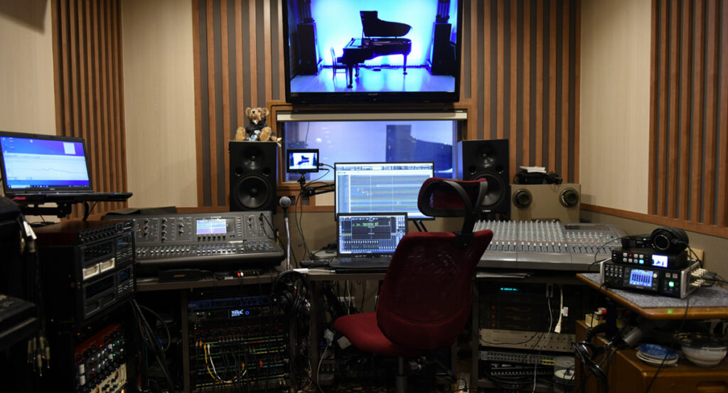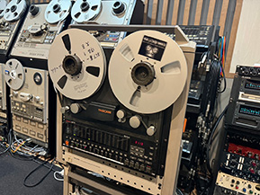 どうしたものかと悩んでいたところ、メーカーの方から一個人が趣味(!?)で運営されているこだわりの、そして他の追随を許さないオンリーワンの技術力を持ったレコーディングスタジオとして、兵庫県西宮市のスタジオ1812をご紹介いただきました。このスタジオの所有者でレコーディングエンジニアも務める梅谷一弘氏は、大正8年(1919年)に創業し、100年以上の歴史を持つ畳・内装工事会社の社長でもあり、そのサウンド部門としてスタジオを立ち上げた、とのことでした。小林幸子氏の代表曲「おもいで酒」の作曲家として知られる梅谷忠洋氏と、アナウンサーでソプラノ歌手の裕子氏夫婦の長男として生まれ、小さいころからフルートを学んできた生粋のクラシック育ちで、自分の作品をより高品質に録音したい一心で一から学んで作り上げたと伺いました。とはいえ、スタジオの壁面いっぱいになるほど多数のマルチトラック・オープンリールレコーダーを所有しているだけでなく、自ら修理・調整もこなしてしまうハードウェアの知識と、高音質のためには1bitの精度やノイズレベルの限界にまでこだわる妥協のない姿勢が口コミで評判を呼び、これまでにも誰もが知っている有名ミュージシャンの仕事を依頼されたことがある職人肌の実力派でした。本件について相談したところ、スタジオにある16トラックレコーダーを利用した6トラックサウンドのサルベージ案を頂けたので、さっそく二人でスタジオにこもってデジタル化に取り組み、短時間でデジタルデータを手にすることができました(写真15、16)。梅谷氏にはこの場をお借りして深く御礼申しあげます。