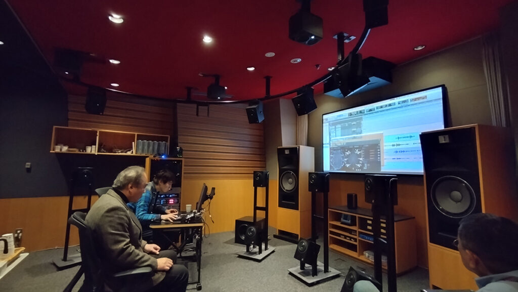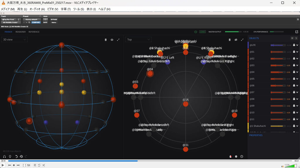 今回は、ソニー株式会社(以下ソニー)から360RA音響セッティングのプロ、渡辺忠敏氏が出張して来られ、直々に調整を行っていただけることになりました。渡辺氏は、ちょうど同じ時期に、新しくできたばかりのグラングリーン大阪内のイベントスペースVS.にて開催されていた「sakamotocommon OSAKA 1970/2025/大阪/坂本龍一」にて、坂本氏が前述した乃木坂のソニー・ミュージックスタジオで360 Reality Audioミックスに立ち会った最後のオリジナルアルバム「12」の音環境再現を担当されていました。全く偶然の運命的同期だったのですが、坂本氏が70年万博で得たインスピレーションや感動を今回の万博に合わせて体験する企画は、まさに松下氏の音源再現とイベント的にも技術的にも双対をなすものと言え、これまでご紹介してきた人の輪の最後をつなぐにふさわしい、最終ピースが奇跡的に埋まりました。