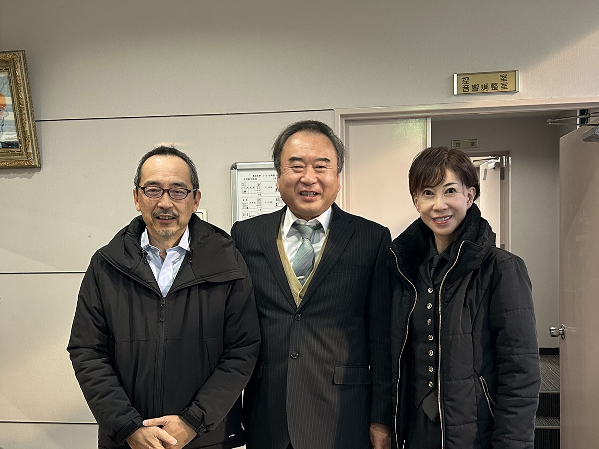 なお、奈良女子大学では、前述の生活工学共同専攻に続いて、女子大学初の工学部を2022年4月に設置しましたが、当初、日之春先生に加えて、兄弟弟子であった坂本龍一氏にも音楽・音響工学に関する講義をお願いしていました。日之春先生は、各学生にPC及び接続するマイクを用意してくれ、それで楽器の演奏能力に関係なく十分音楽を構築できる、とおっしゃっていたことから、現在のコンピュータ技術を用いてミュージック・コンクレートの意義を伝えようと考えておられたことがわかります。残念ながら、お二人のご逝去によりこれもかなわぬ夢となってしまいました。日之春先生が坂本氏を誘ってくださったメールには、