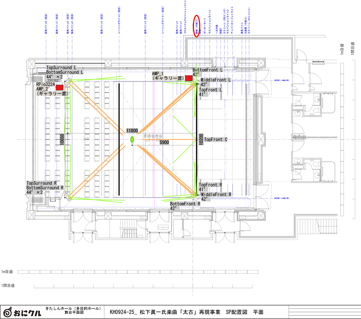 そんな時、奈良女子大学工学部のアナログ回路/デジタル回路の講義をご一緒していたソニーのDistinguished Engineer澤志聡彦氏から、同氏のグループが開発した「360 Reality Audio(サンロクマル•リアリティオーディオ:以下「360RA」と表記)」のお話を伺って、これだ!と閃きました。すぐソニーに協力を依頼し、通常の音響機器の左右2個のスピーカーでは重なり合って聞き取りにくい11トラックの音それぞれに位置情報をつけ、バーチャルに360度の音響空間を再現して立体的に聞こえるよう楽曲の空間的再構成に挑戦しました。残念ながら、当時何チャンネルの音がお祭り広場のどのスピーカーから送出されていたかを示すチャートや記録は発見することができませんでしたので、これに関しては当時通りの厳密な再現と申しあげることはできません。しかし、音の空間的な分離がよくなると、それぞれのチャンネルから聞こえてくる音の了解度や定位の安定度・正確度も増し、結果的に一つ一つの音のつややかさやキラメキ具合が増したようにも感じられ、また空間的に配置されることで音の前後や左右方向への動きやゆらぎも加味されて、最初に2chステレオで聞いた時とは全く異なり、30分の全編を通して聴いても疲れず、音や作品自体への集中力が持続する効果が得られました。