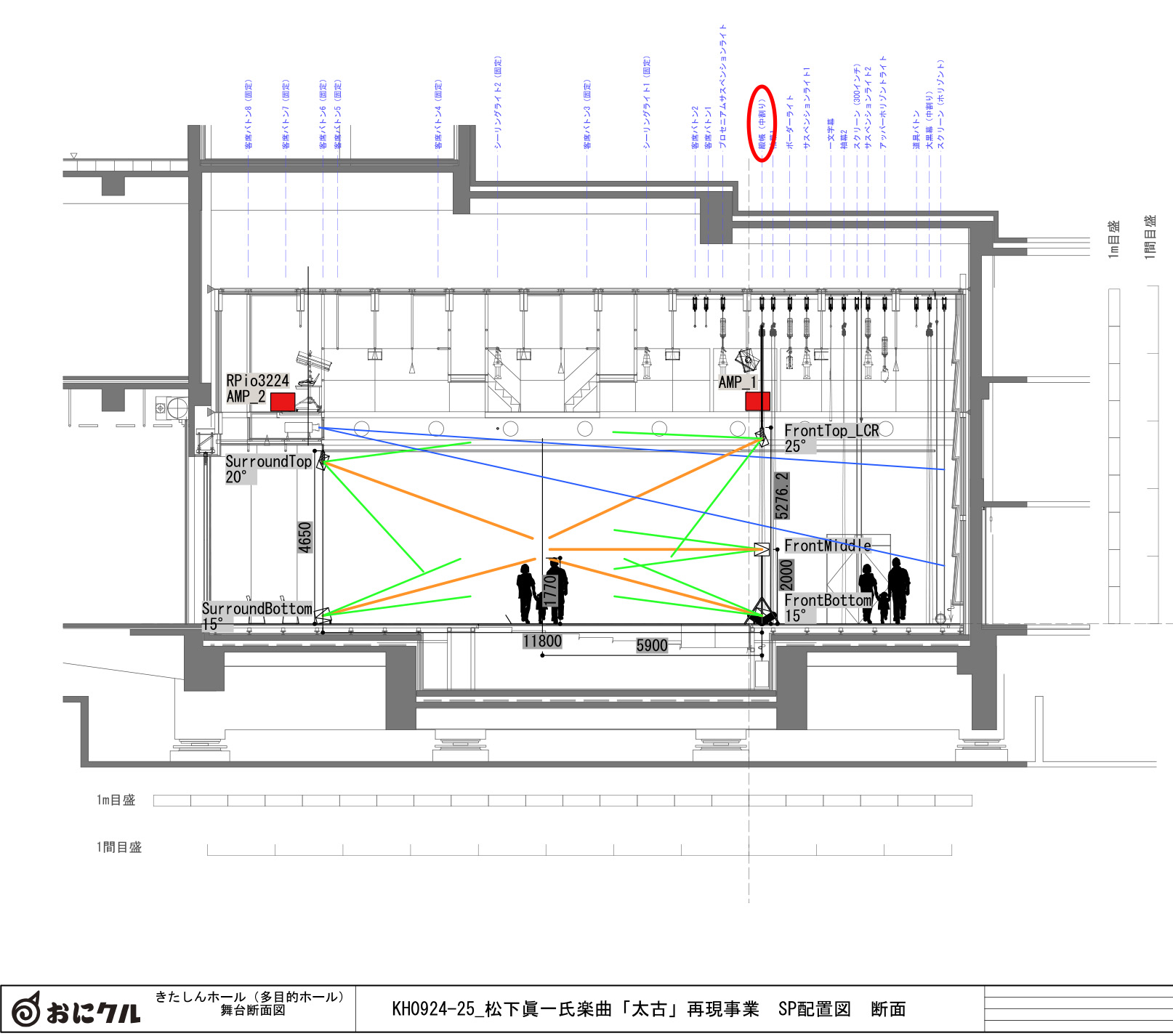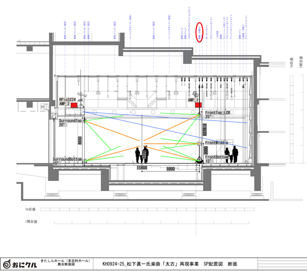 さて、楽曲は再現できたとして、この音を来場者の耳に届けるためには、最終段階としてアンプやスピーカーのセッティングが必要です。特に、今回は三次元立体音響を実現する特殊なシステムですので、繊細な調整なくしてリアリティは生まれません。もちろん事前に、部屋の広さや残響の具合、人や展示物の存在など、あらゆる要素を考慮して音響設計・デザインをされるわけですが、最終的には現場でのワンオフ・セッティングになります(図3、4)。さすがにこれは相当の経験者でなければ、せっかくのシステムの持つポテンシャルを生かしきれず、かえって効果が薄れたりして残念な結果に終わってしまいます。