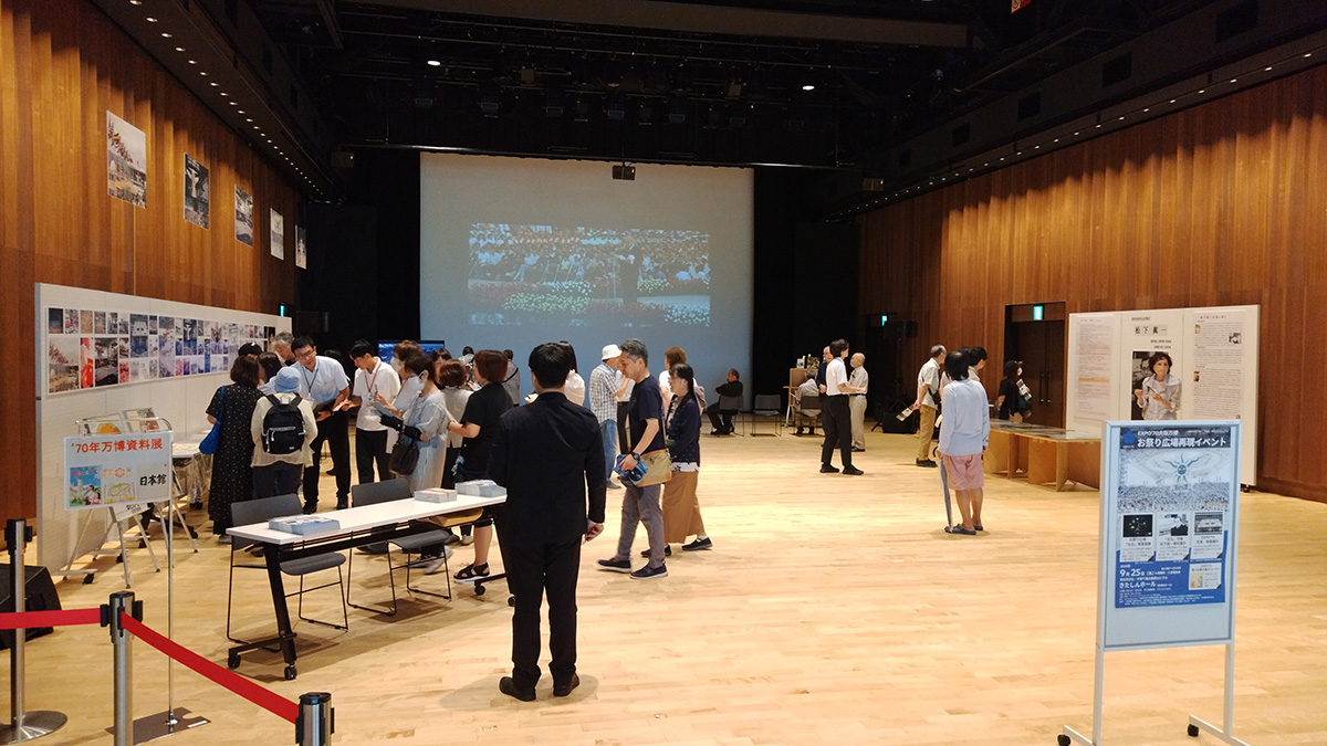 (前方のスクリーンでは当時のお祭り広場の実写映像、左壁面側には当時のオリジナルパンフレット等の資料を万博協会のご厚意により展示。また、右壁面側では野いばらの会が用意した松下氏の各種資料を展示)