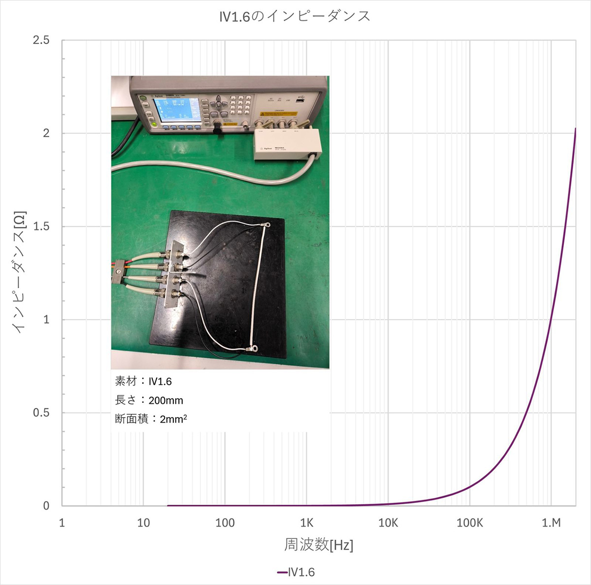 回路設計やノイズ対策を実施するうえで良く耳にするのが「インピーダンス」です。交流は直流と違い、周波数によって抵抗(インピーダンス)が変化します。図1は、タフピッチ銅線IV1.6(2sq)長さ200mmに数ボルトの交流電圧を印加し、低い周波数から高い周波数(20Hz~2MHz)までスイープした際のインピーダンス特性です。図から解るように、周波数が高くなるにつれインピーダンスが上昇しています。