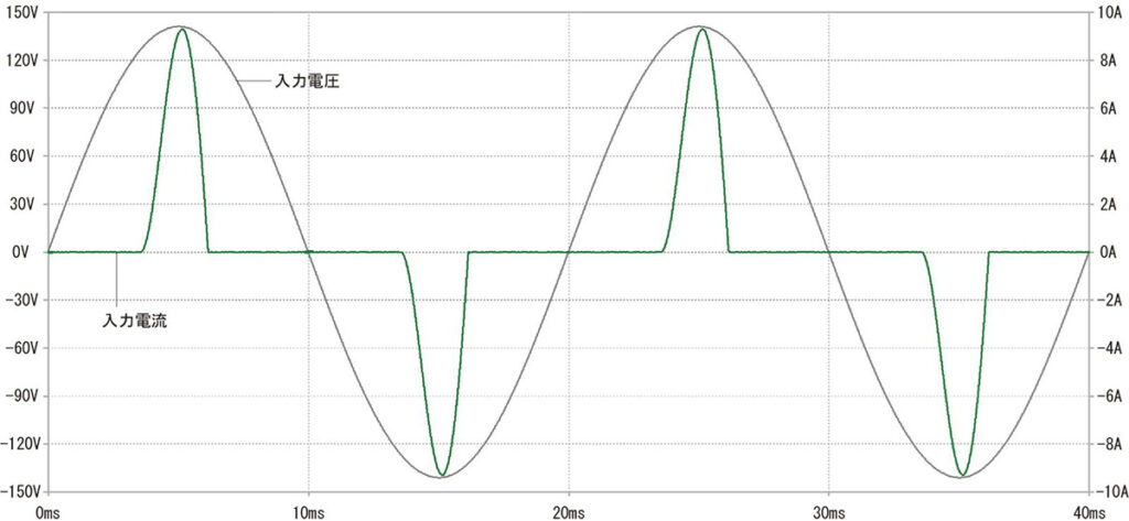また、図3は図2の回路に電源(AC100V)を加えた時のシミュレーション波形です。図3からお分かりの通り、電流は入力電圧(正弦波)のピーク電圧付近のタイミングにおいてのみ流れています。これは図2のアルミ電解コンデンサー:C1に充電する電流になります。