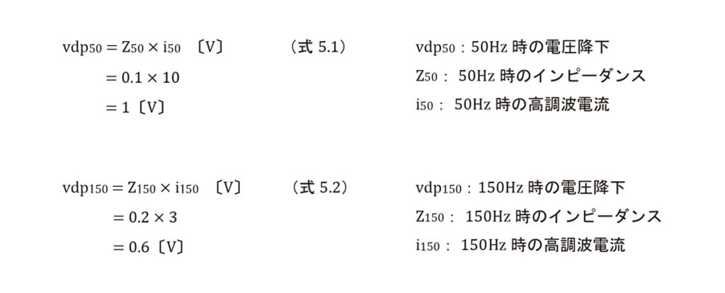 次に3次の高調波150Hzに対するラインインピーダンス:Z150が0.2Ωだったとしましょう。そこに3Aの電流が流れると0.6Vの電圧降下が発生します。ラインインピーダンスは先の実験(図1 IV1.6のインピーダンス特性)で高周波になるにつれ上昇することがわかっているので、高次の高調波成分のレベルが低くても電圧降下が発生します。