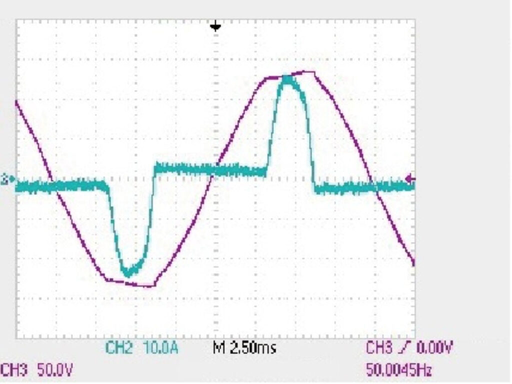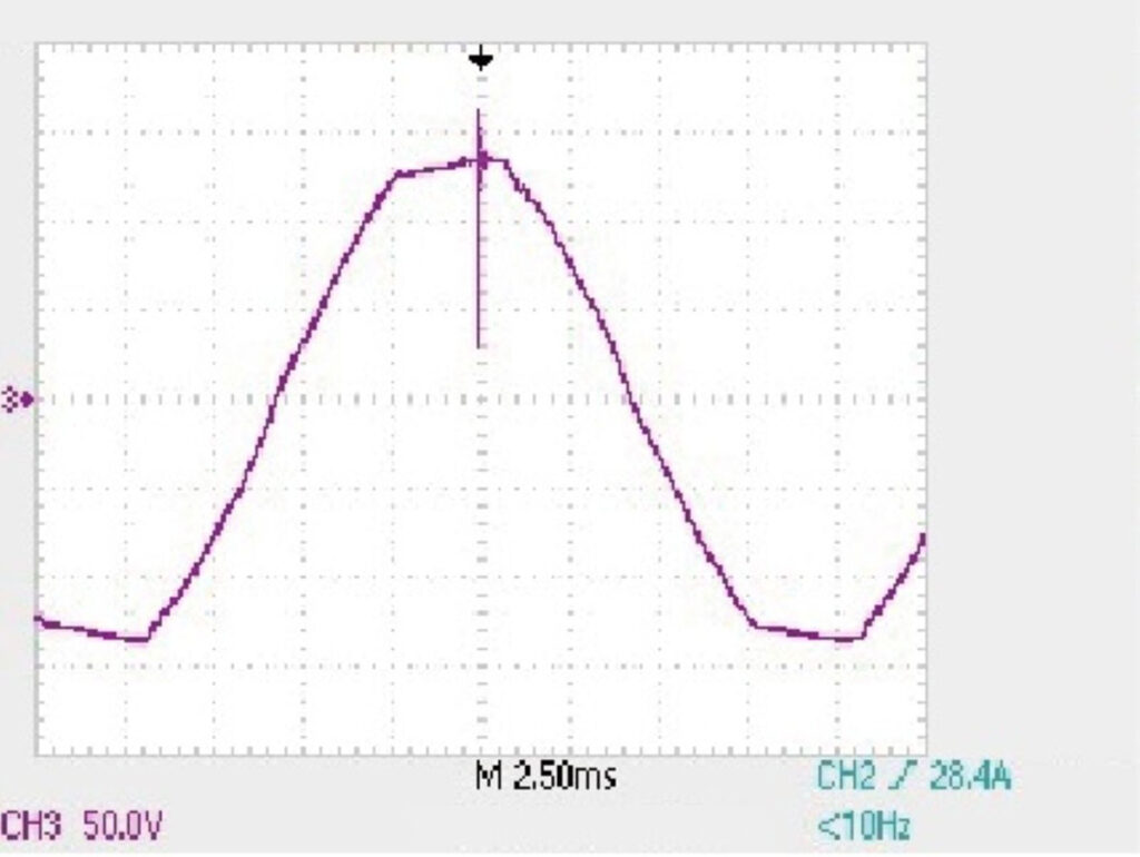 図6は、弊社工場内の電源にコンデンサーインプット型負荷を接続した際の電圧、電流波形です。ピーク付近が潰れ、波形も歪んでいる様子が確認されます。この時の波形歪率は2.3%、無負荷の場合は1.6%でした。ラインインピーダンスの影響がいかに大きいかお解りいただけると思います。