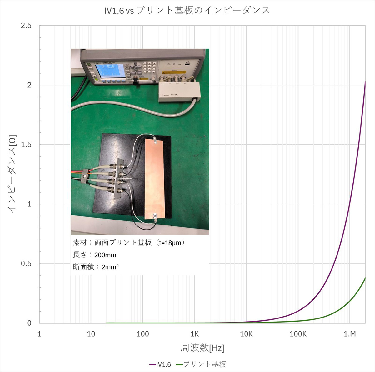 しかし、同時にプリント基板で大電流流すとなると、だいぶリスキーだなとも思ったわけです。でも、やりもしないうちから諦めるのはしゃくなので、やっぱり実験することになるのです。図9は両面プリント基板の長さを200mm、導体断面積を2sq(パターン幅:55mm/片面銅箔厚:18μm)にし、図1のIV1.6線のインピーダンス特性と比較したものです。