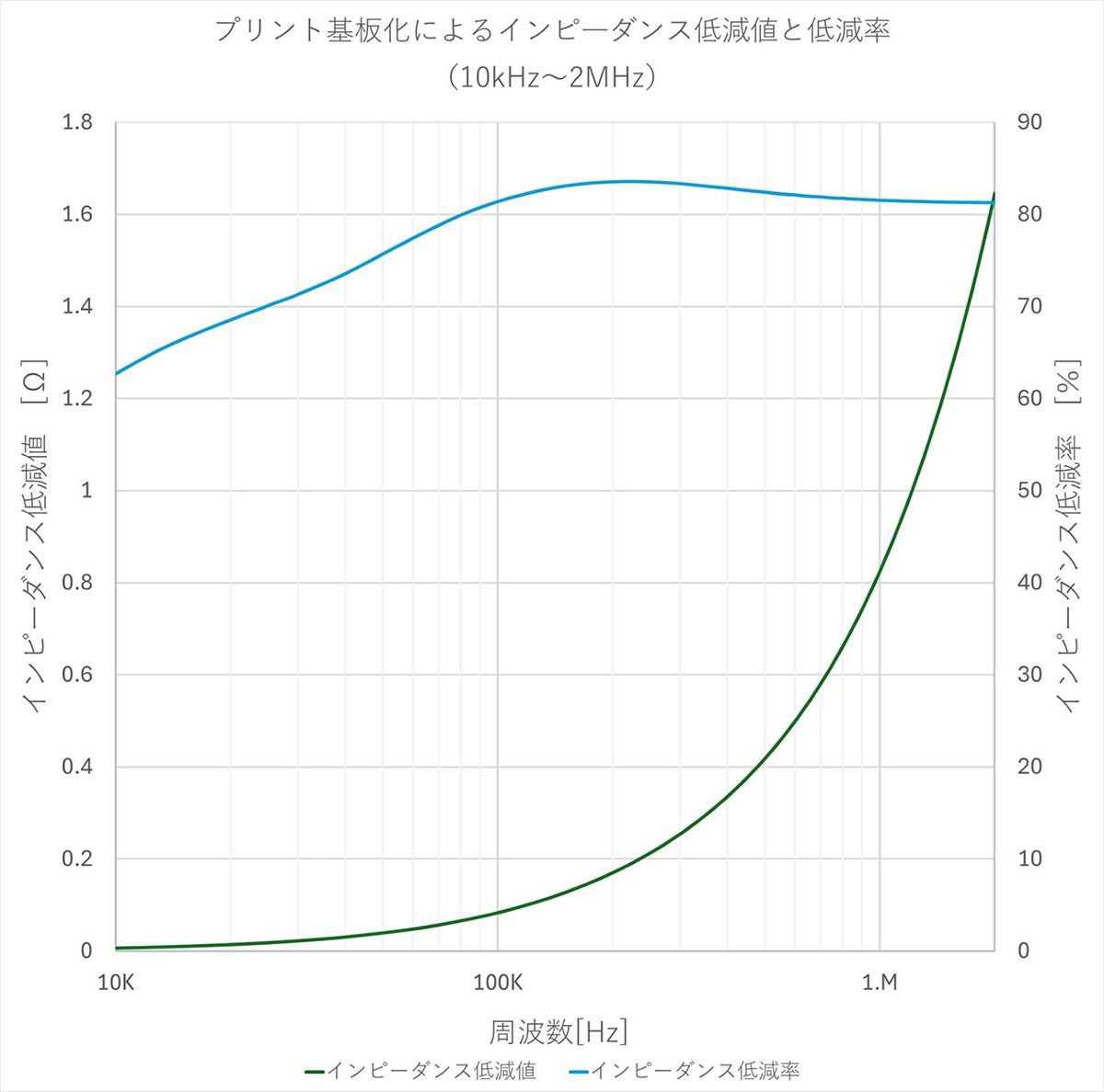 図10は配線をIV線からプリント基板化した時のインピーダンスの低減値(差分)と低減率(差分率)です。プリント基板化により10kHzから2MHzにおいて、63%~83.5%(最大)のインピーダンス低減が実現しています。