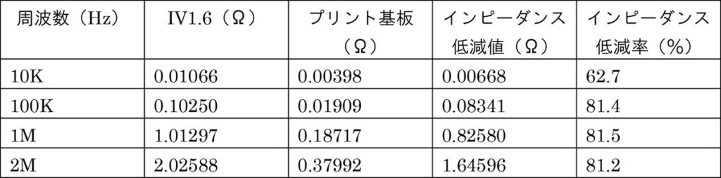 表1 各周波数におけるIV線とプリント基板のインピーダンス低減値と低減率
