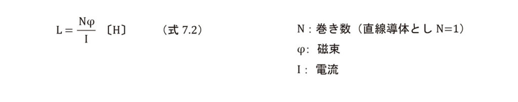 また、L:インダクタンスは次式で求められます。導体に電流が流れると磁束が発生するので、その磁束が大きければインダクタンスが大きくなることを示しています。