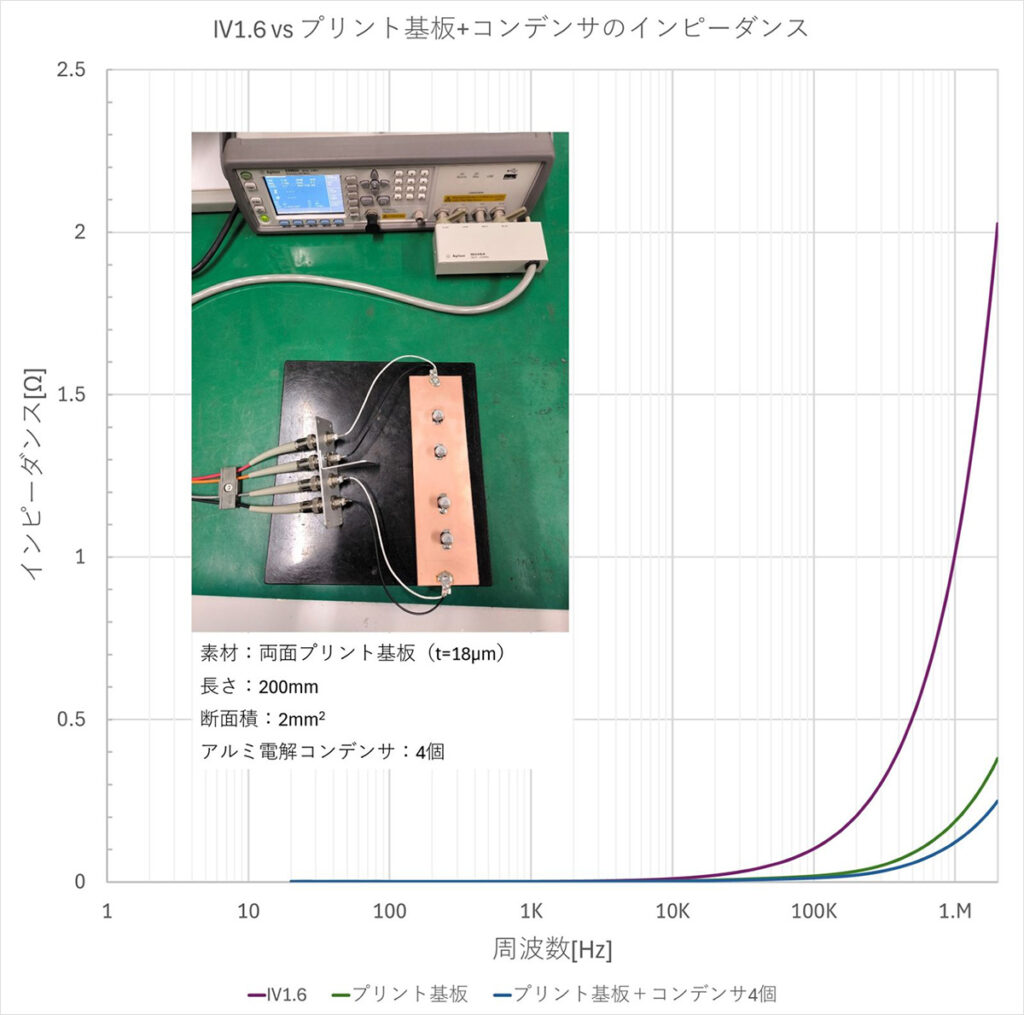 結果を見て、正直プリント基板の威力にたまげました。低い周波数においてはIV1.6線と同レベルで推移し、10kHzあたりからインピーダンスの差が開き始めます。