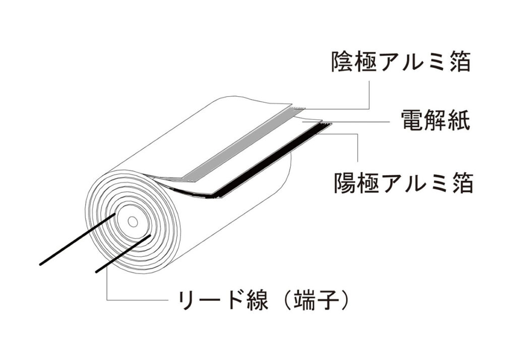 図12はアルミ電解コンデンサーの内部構造を簡易的に模したものです。±の電極間に電解紙がサンドイッチされ、バームクーヘン状に巻かれたものになっています。電気回路的に±の電極はプリント基板上のパターンと同電位になり、先の測定経路内のGND(基準)との間に、やはり浮遊容量が多く発生します。この仮想アース技術(コンデンサー配置)によるインピーダンス低減は、これに起因するものと推察しています。