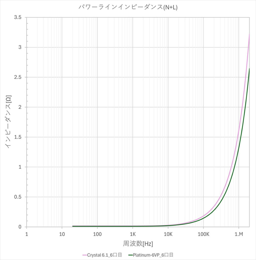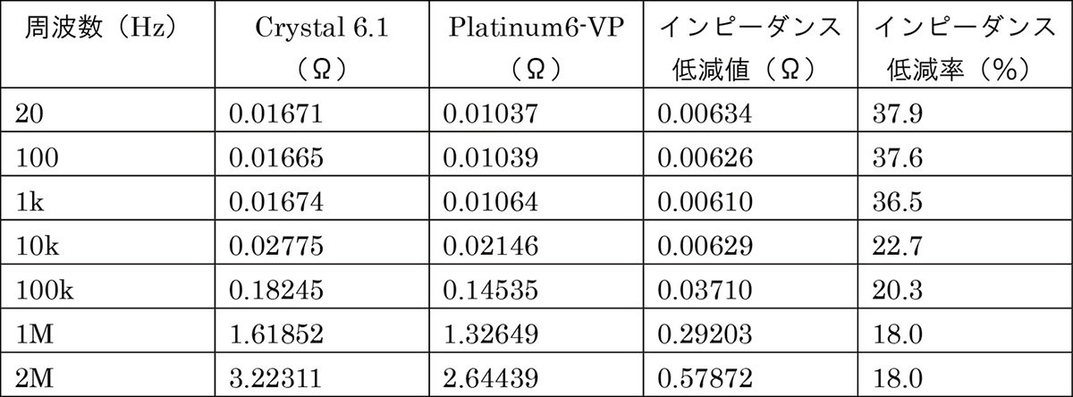 また、Platinum6-VPはCrystal6.1と比較しても配線長が長いため、不利な立場にあるわけですが、プリント基板および仮想アース技術の融合により、周波数100kHzにおいて約0.04Ω、1MHzにおいて約0.29Ω、2MHzにおいて約0.58Ω、Platinum6-VPの方がインピーダンス低減できています。