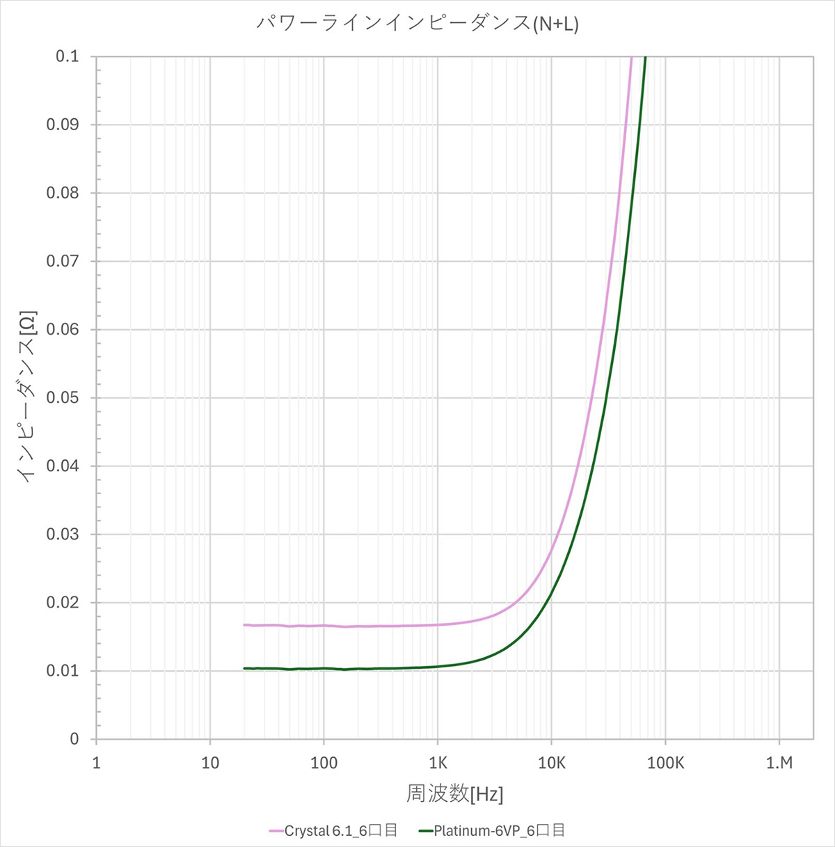 低周波領域(20~1kHz)付近において、Crystal 6.1の0.017Ωに対し、Platinum6-VPでは0.011Ωと低くなっています。低周波領域においては導体の断面積がインピーダンスを支配するため、その恩恵を受けているものと推察します。