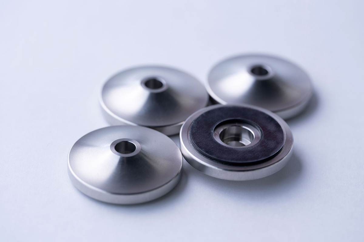 振動対策のSTEP1として採用したのが、図17に示す専用考案された30φの円錐台(富士山型)インシュレーターです。床に対する設置面積を多くとることで安定感を提供すると共に、トップ部分に近づくに従い絞り込まれたデザインは、ハードニング特性を持った非線形ばねの性質を示します。