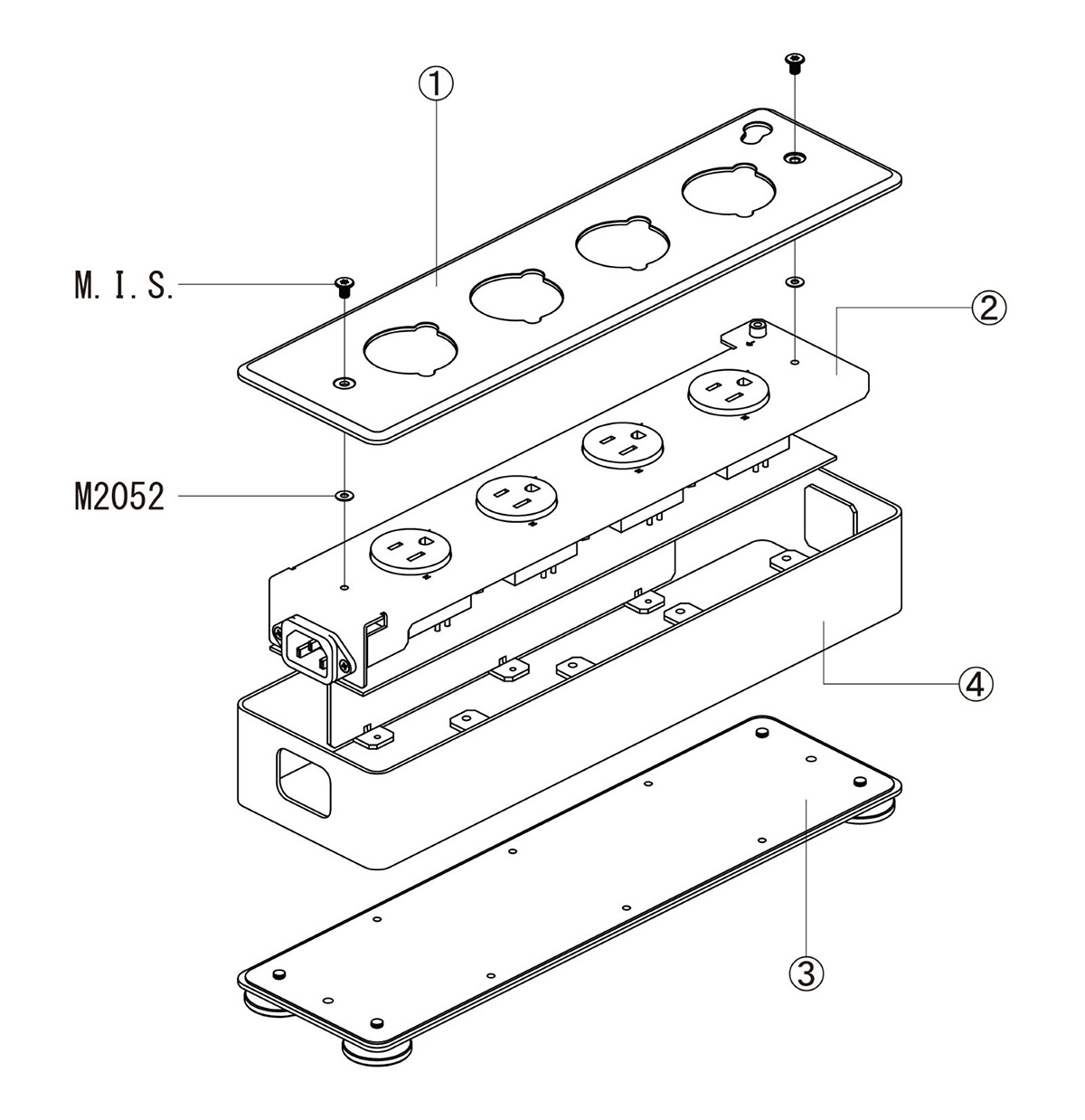 M.I.S.は電源タップ内の全パーツ(コンセント、インレット、プリント基板など)をユニット化し、トップカバーに吊り下げるというものでした。オーディオ機材含め、電源タップは床からの振動を大きく受けます。この振動は音質に対し大きく影響するものと言われています。M.I.S.はこの振動に対し大きな効果をもたらすものとして採用してきました。