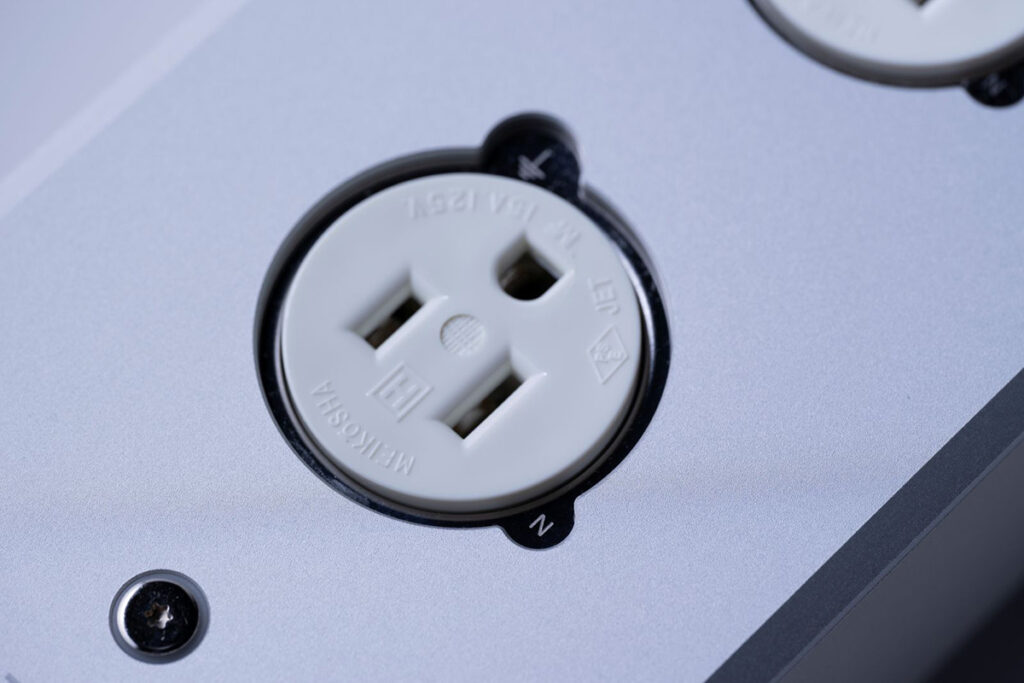 上記は設置された床や空気伝搬で入り込む振動の対策として大変有効に作用するわけですが、これだけではまだ不十分です。電源タップは使用上、入力電源ケーブル(インレットプラグ)や各種接続機材の電源ケーブル(コンセントプラグ)が接続されます。せっかくサブシャーシを吊るして外筐と遮断しているのに、接続されるケーブルプラグが外筐に触れてしまっては何の意味もありません。