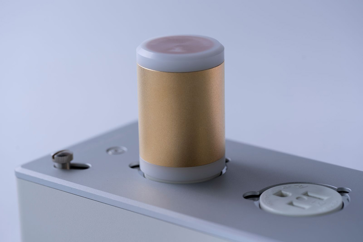 メインボディーはクールグレイと称されるホワイト系梨地マット色で塗装され、純粋さを醸し出しています。振動抑制のために本体隅に設けられた専用インシュレーターもまた、本体の安定性を向上させると共にデザイン的な安定性をもたらしています。