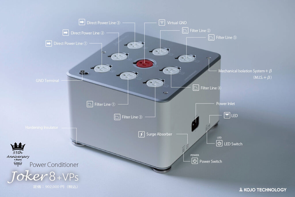 5口のフィルターラインと3口のダイレクトライン、計8口の出力コンセントに加え、仮想アース接続専用のコンセント(赤)を兼ね備えると共に、新たに開発した振動対策機構「M.I.S.+β」が取り入れられたパワーコンディショナーです。Platinumシリーズ同様、35thアニバーサリー+Jtuneモデルとなっており、生産台数は限定25台です。また先着20台には専用オリジナルケーブル(非売品)が付属される特典付きとなっております。